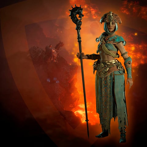 Buy Diablo 4 Jazeraint Set available for any class and get a rare set! This transmog set looks different on each class. The sorcerer finds himself beneath a turquoise mantle. A barbarian dons a gold Spartan mask. The druid is adorned in the regal trophies of fallen beasts. For the rogue and necromancer, their visages mirror their essence. The rogue and the necromancer find their harmonious reflection, a portrait of both strength and identity.
