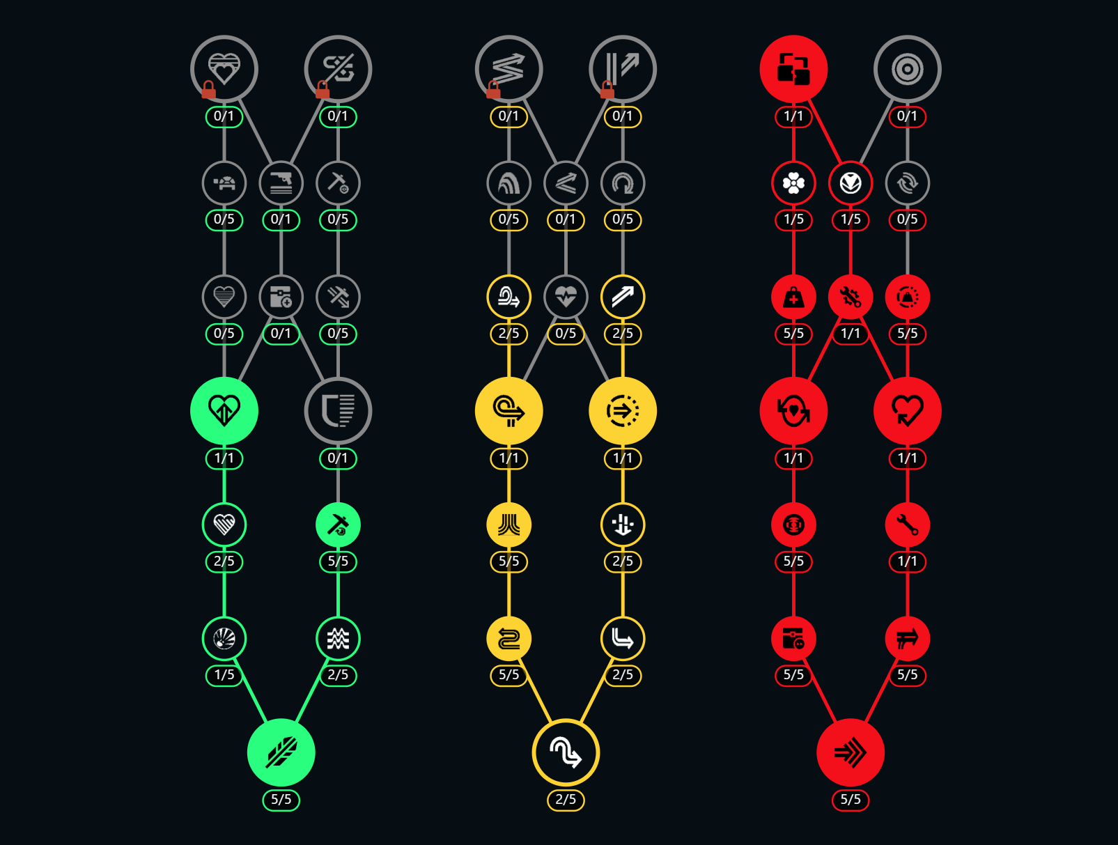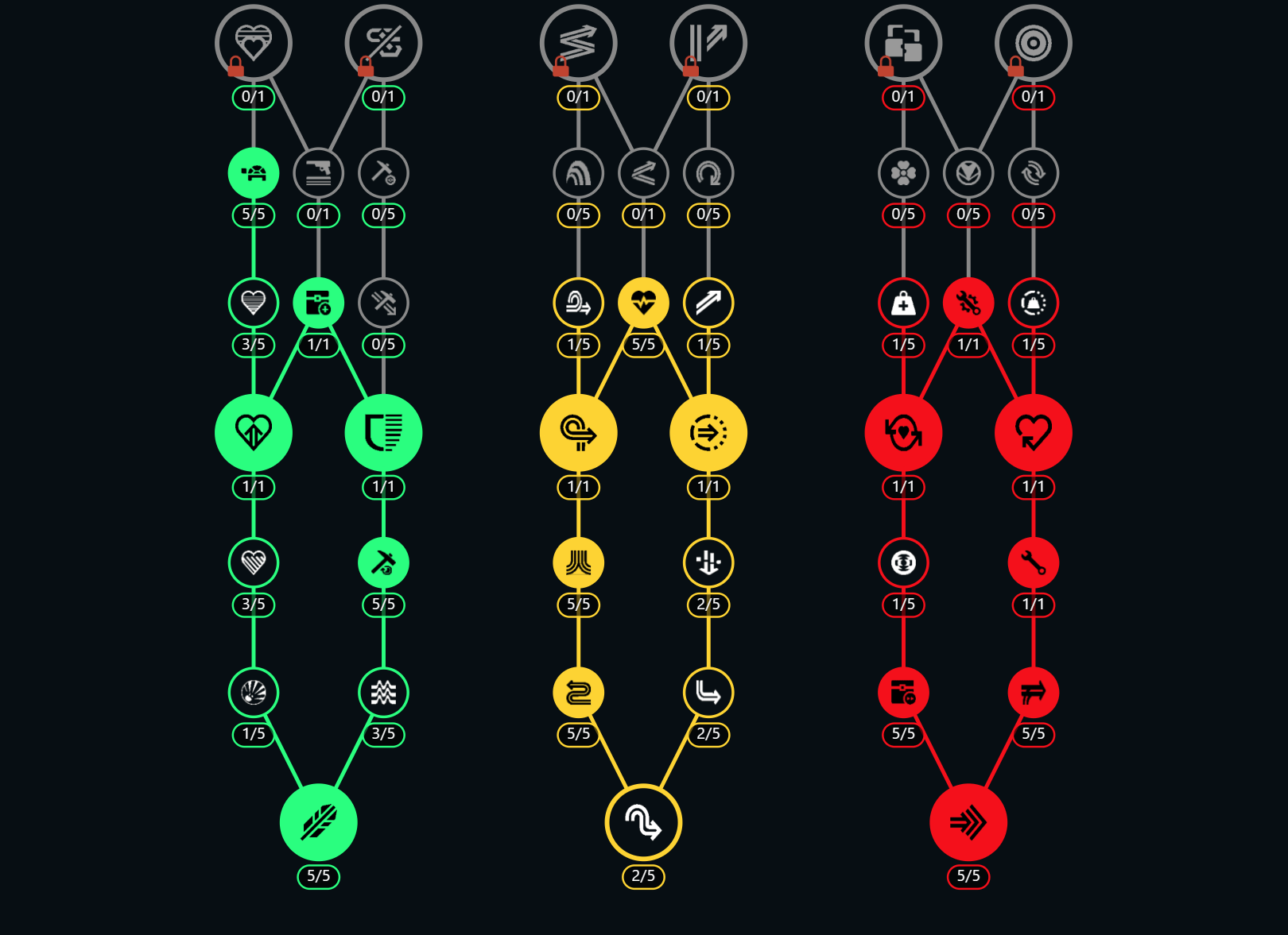 The Survival branch rounds it out with In-Round Crafting, Silent Scavenger, and Broad Shoulders. You’ll be able to craft healing items and ammo on the fly, loot faster, and carry more before slowing down.