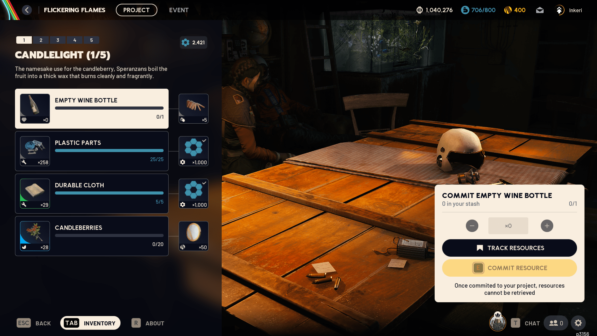 This can be found in your hub and is located under the Projects tab. The project consists of five stages and needs the following combined seasonal resources: Candleberries, candles, wires, batteries, and more. Every level completed raises the level of Speranza lighting, food displays, and even decorations. Every level that is completed gives you:
