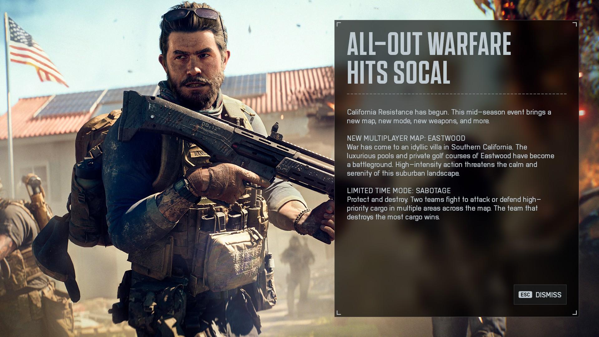 To help you complete the entire event track, Phase 2 brings in 12 limited-time challenges. Each challenge rewards progress toward the California Resistance pass, and completing all of them will give you more than enough points to clear every reward tier before the event ends. These missions will encourage you to try out the new weapons, play on Eastwood, and experiment with the different classes during the event.