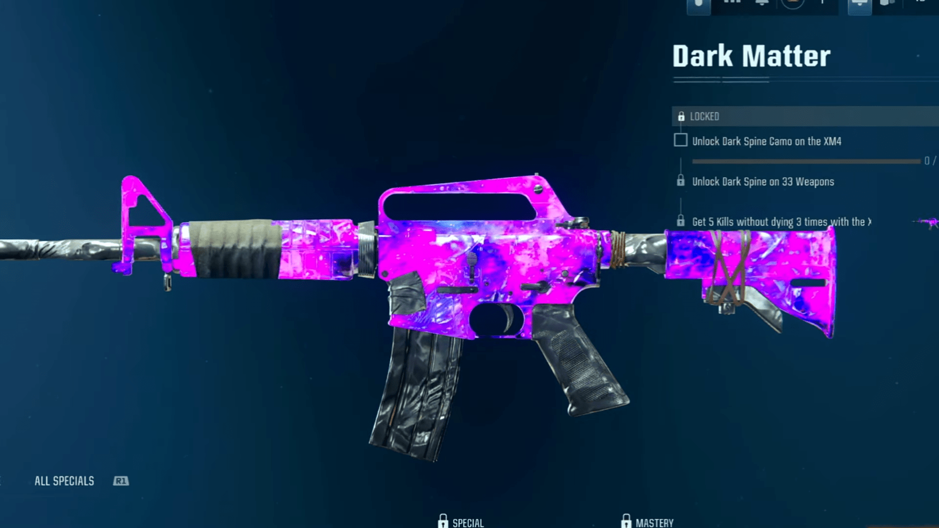 Dark Matter Camo — To obtain this Camo, you need to unlock Master Camo Tier 3 (Dark Spine) for every weapon across all multiplayer weapon classes. Afterward, complete the specific Camo challenge to fully unlock Dark Matter.