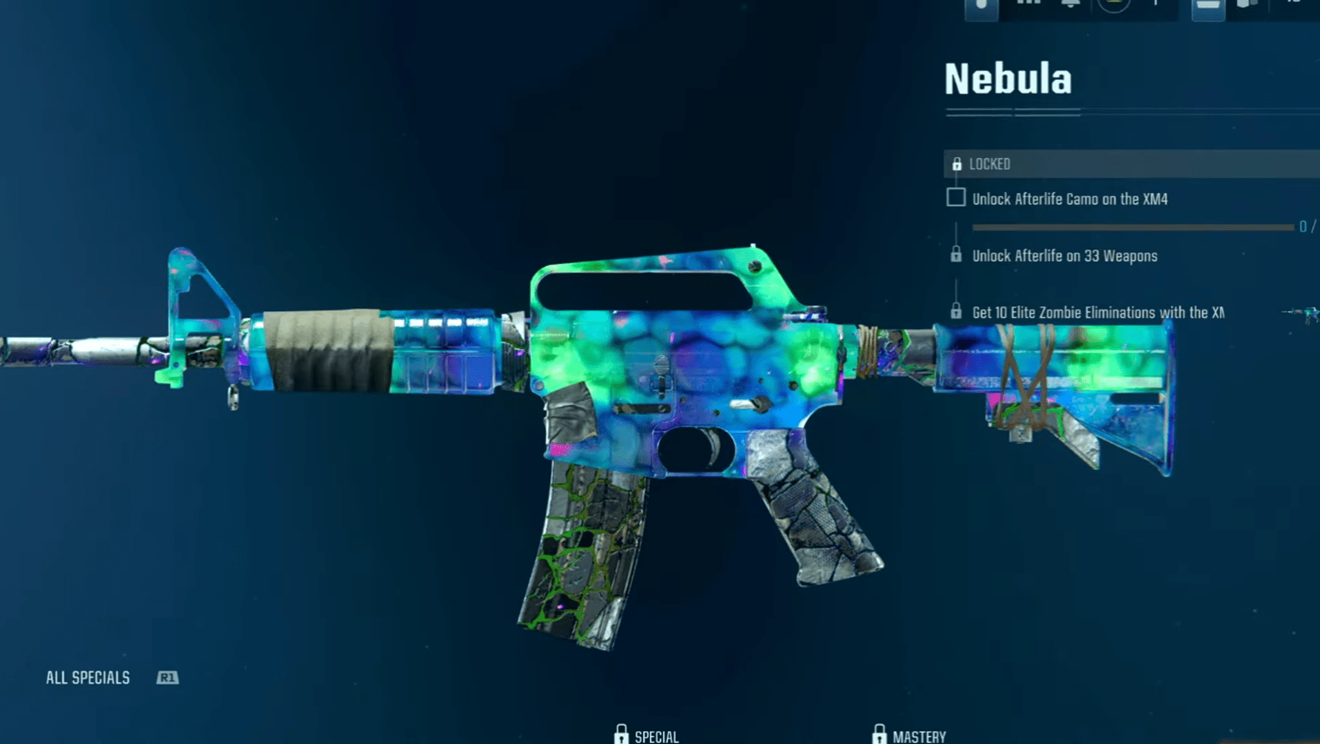Nebula (Animated and Dynamic) Camo — To obtain this Camo, you need to unlock Master Camo Tier 3 (Afterlife) for every weapon in all Zombies weapon classes. After completing that, finish the applicable Camo challenge to earn the animated and dynamic Nebula Camo.