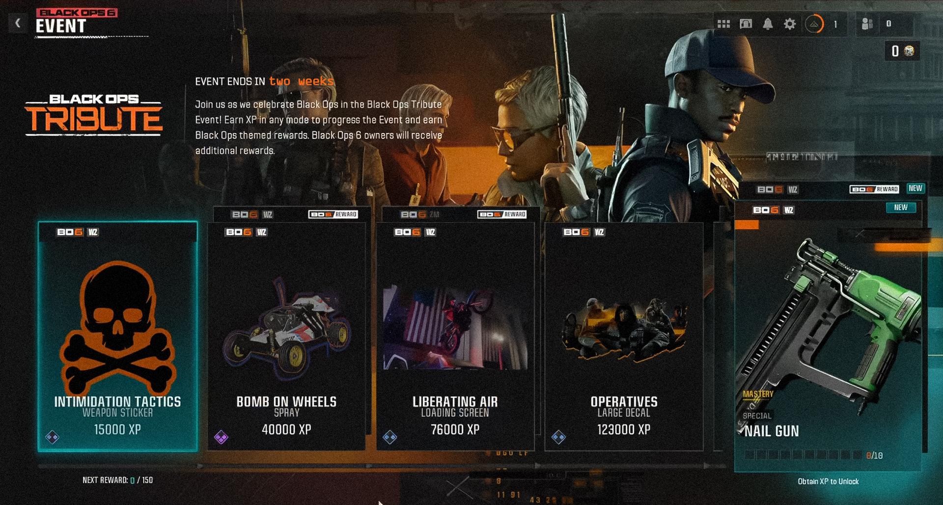 The Black Ops Tribute Event in BO6 and Warzone features lots of valuable rewards, from exclusive skins and weaponry to rare in-game content. Unlocking all rewards in the Black Ops Tribute event requires gaining 670,000 XP in total. By completing XP-based challenges in every mode, you can unlock cosmetics like the Intimidation Tactics sticker and gear up on heavy-hitting equipment like the Death Machine scorestreak.