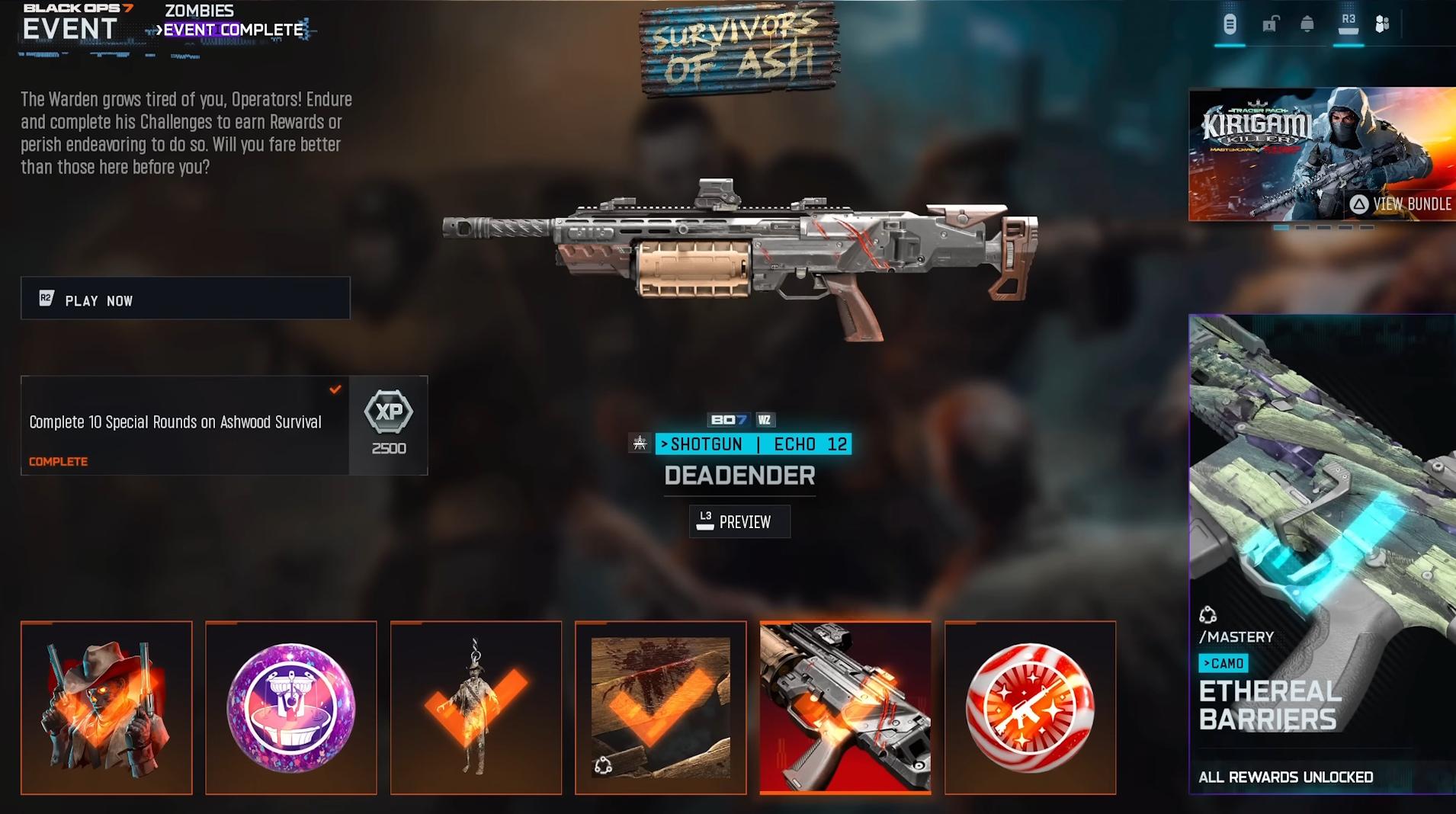 In Black Ops 7, the Deadender is a Legendary Weapon Blueprint for the Echo 12 Shotgun. In Season 3, this is the only free way to get this item. You can get it by completing 10 Special Rounds on Ashwood Survival, which is the challenge 5 reward in Survivors of Ash. You don’t need to buy anything from the store or use CoD Points.
