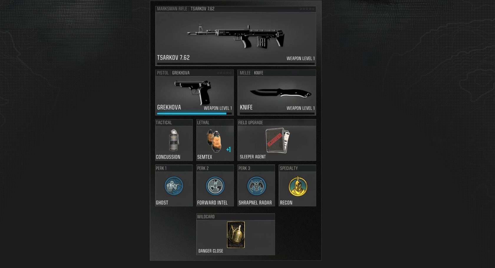 Recon loadout is all about stealth and deception. First, you can use Sleeper Agent to make your presence virtually invisible, tricking enemies into thinking you’re not a threat. Then, add Ghost to further mask your movements and Forward Intel to give you enhanced map awareness. Once you spot your target, switch to an aggressive stance by taking them down swiftly with the Tsarkov 7.62.