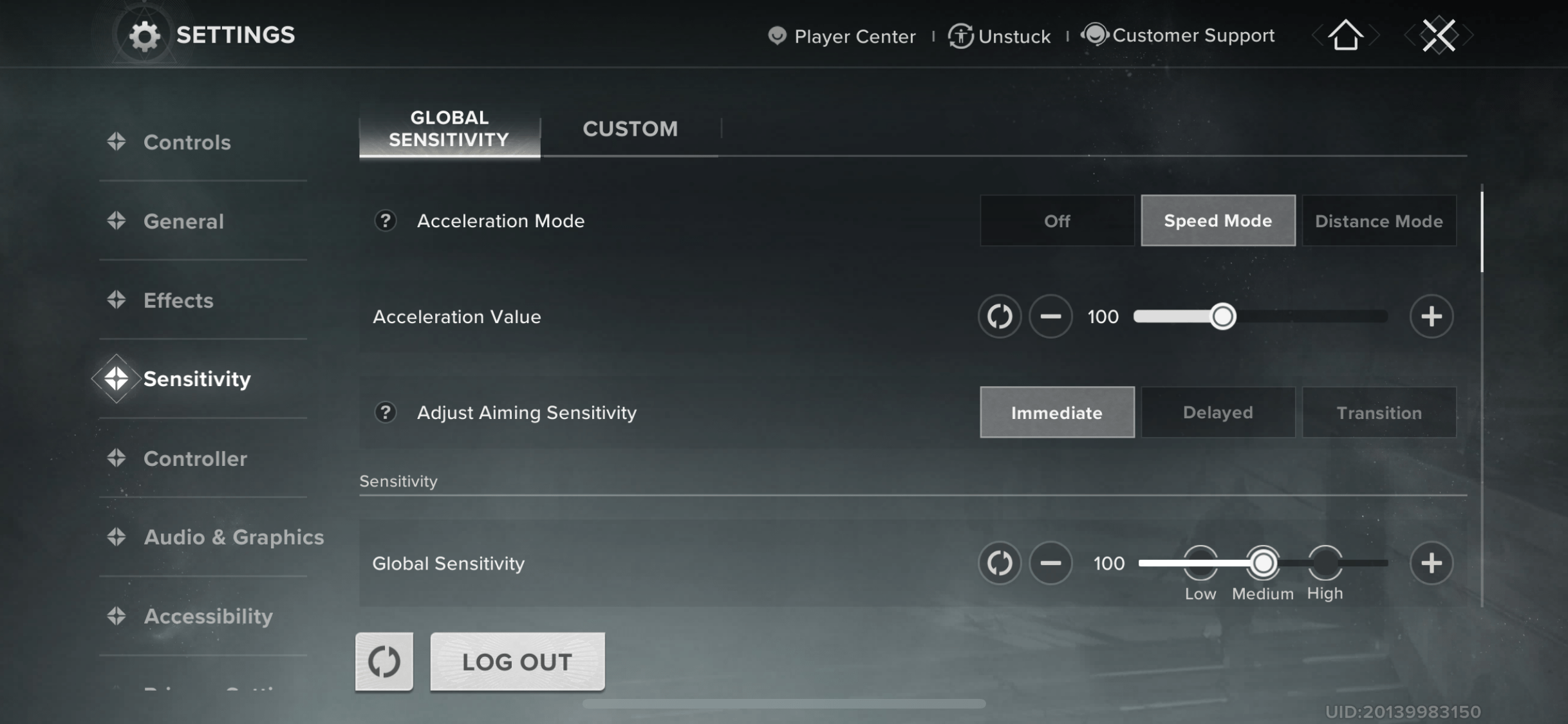 - Set Controller Aiming Sensitivity to Immediate or Transition. This is in order to prevent lag when switching modes and still be responsive in fast battles.