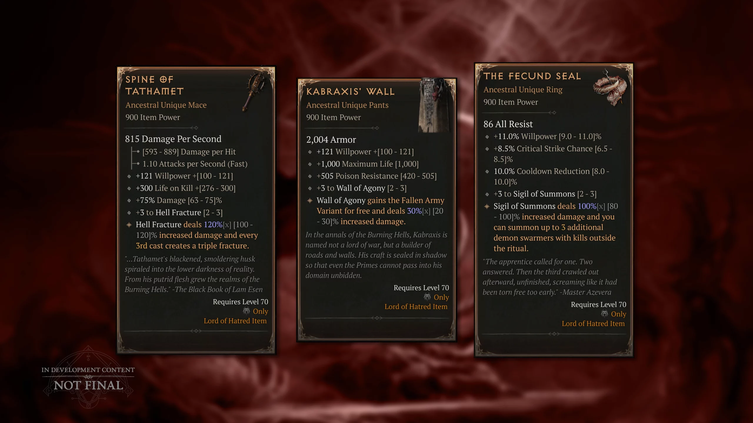 | Tyrant’s Grasp Vanguard | Willpower, Max Life, Cooldown Reduction, Close Damage, Hellfire scaling |