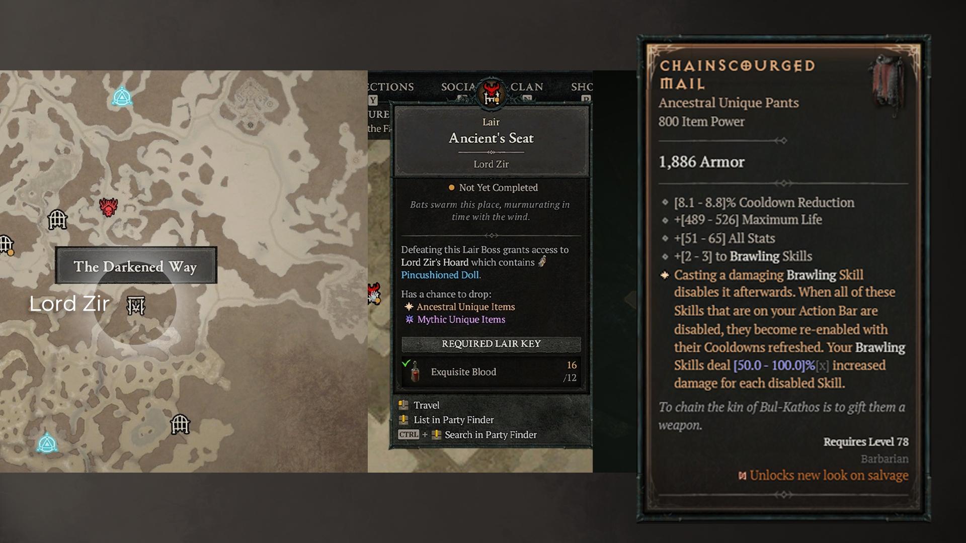 Barbarians in Diablo 4 Season 11 receive Chainscourged Mail, an item that contributes to aggressive melee play. Lord Zir is your main farm target at the start of the season, as he also drops a unique item for Spiritborn. To summon Lord Zir, bring 12 Exquisite Blood from Legion Events and World Bosses to the Darkened Way altar.