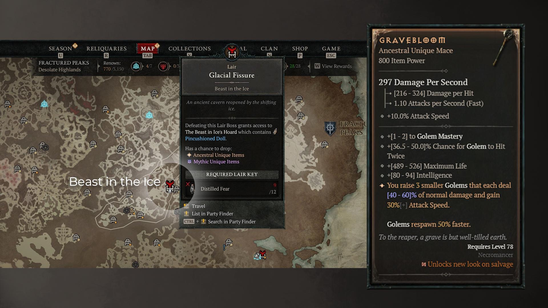 Gravebloom changes the usual summoner Necromancer gameplay in Diablo 4: instead of one bulky minion, you get three fast mini-golems at once. Beast in the Ice is the direct and only source of equipment, so you go there first. To summon the Beast in the Ice, use 12 Distilled Fear earned in Nightmare Dungeons at the Glacial Fissure ritual.