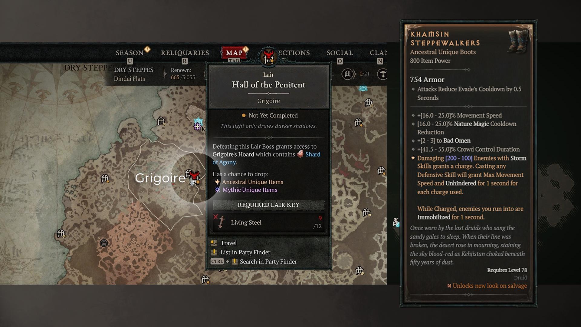 Khamsin Steppewalkers take Druid mobility to a whole new level. If you play through nature, quick bursts, and constant Unhindered effects, these boots work perfectly. Grigoire, The Galvanic Saint, is a must-have boss for all Druid players in the early days of the season. To summon and kill Grigoire, offer 12 Living Steel collected from Tortured Offerings during Helltides at the Hall of the Penitent.