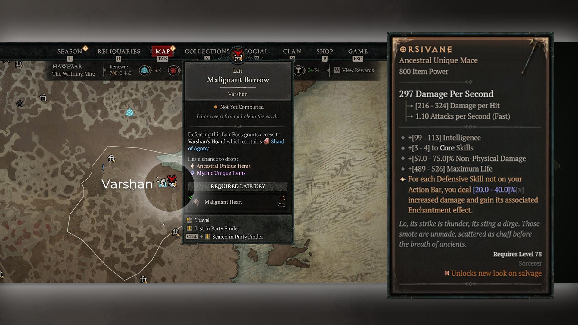 Orsivane supports Sorcerers who want to play Diablo 4 Season 11 more creatively without taking up two slots for mandatory defensive skills. Varshan is the only source, so it becomes a key farming point for Sorcerer players. To summon Varshan, turn in 12 Malignant Hearts from Whispers and Helltides at the Malignant Burrow.