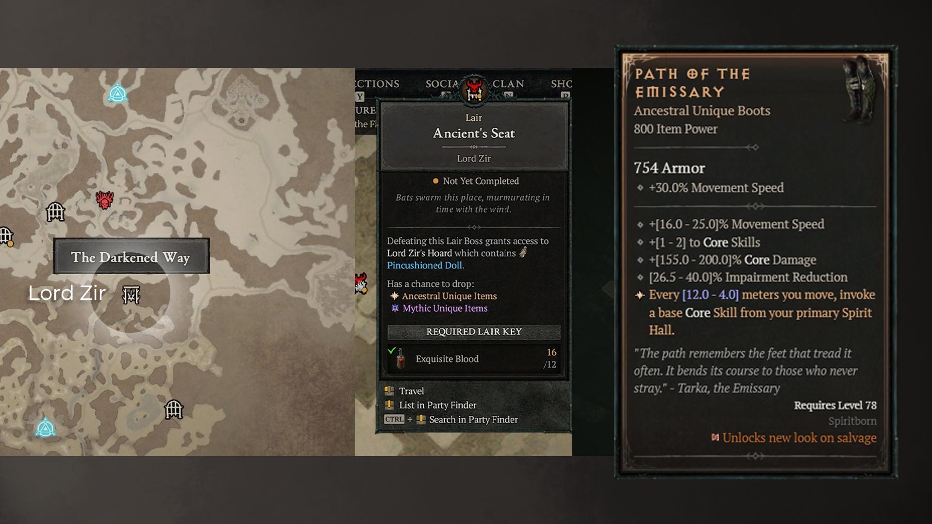 Path of the Emissary — new boots that enhance the Spiritborn combat style through powerful movement, collapse, and class mechanic interaction effects. Lord Zir drops them along with the Barbarian unique, so farming him automatically completes two objectives at once. To summon Lord Zir for Spiritborn boots, again use 12 Exquisite Blood at the Darkened Way ritual site.