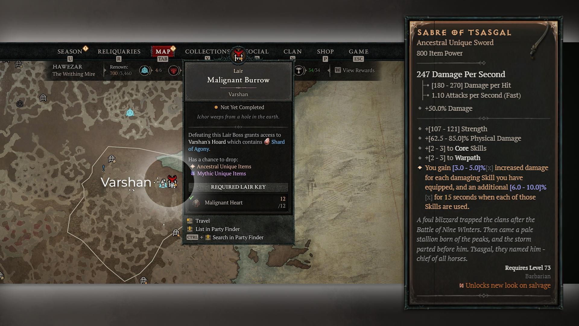 - Jump into the Tree of Whispers and Elites: These provide Malignant Hearts, used to summon Varshan. Treasure Goblins can also drop them, so always hunt those down when you spot one.