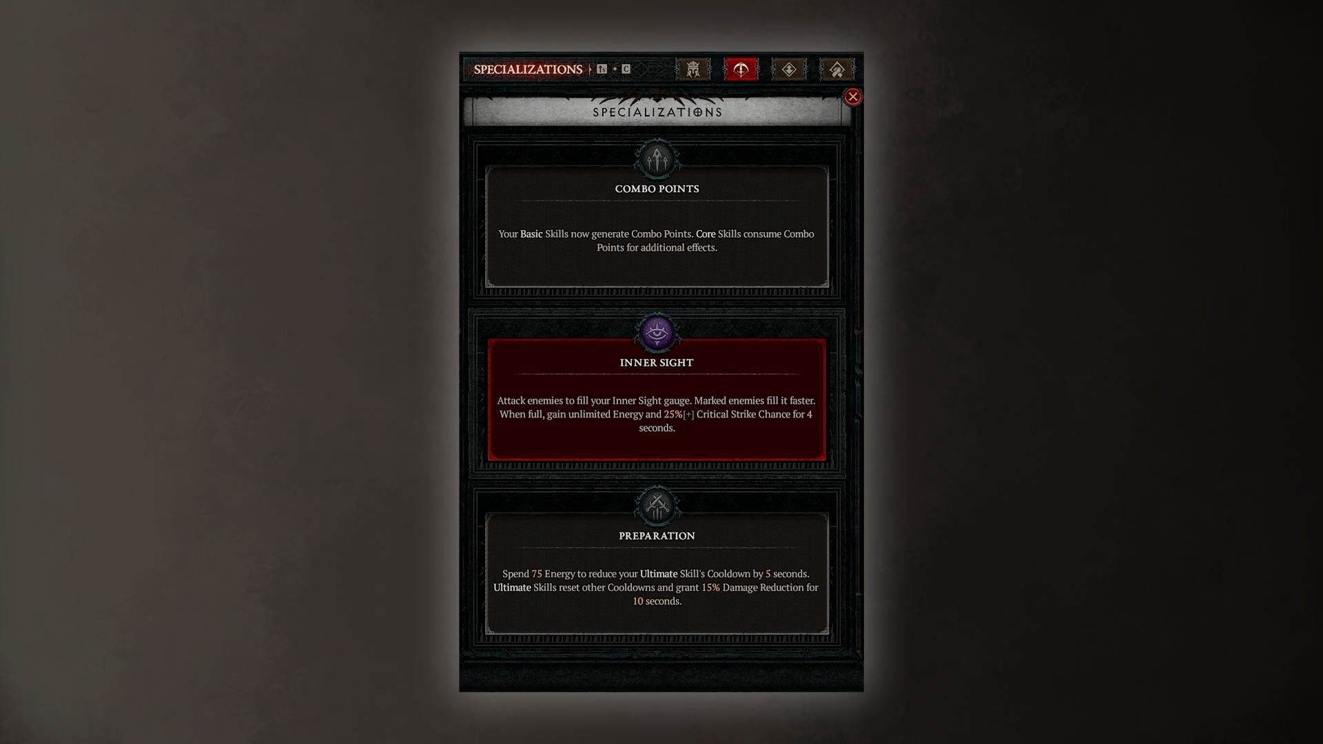 - Preparation (30 Level) — Spend 75 Energy to reduce your Ultimate Skill’s Cooldown by 5 seconds. Ultimate Skills reset other Cooldowns and grant 15% Damage Reduction for 10 seconds.