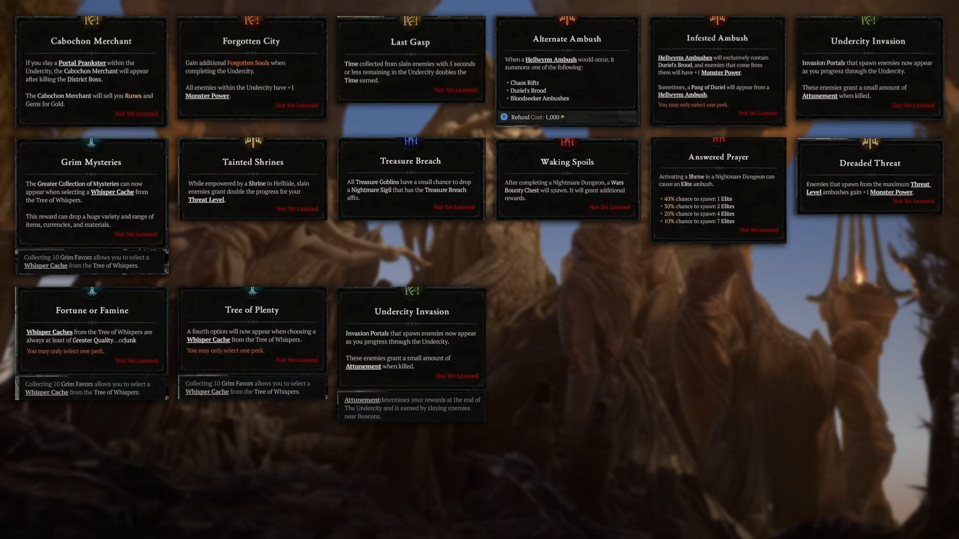 | Grim Mysteries | The Greater Collection of Mysteries can now appear when selecting a Whisper Cache from the Tree of Whispers. This reward can drop a huge variety and range of items, currencies, and materials. | |