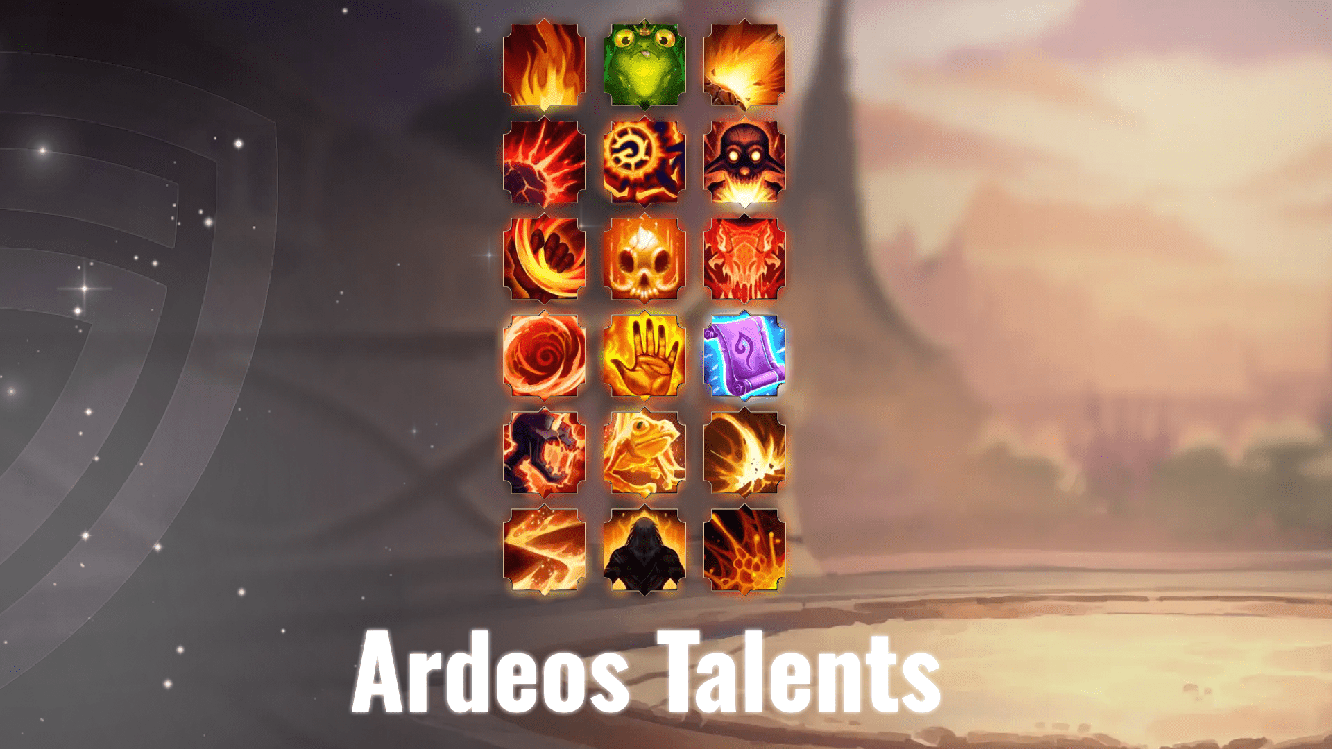 Ardeos’ talents shape his rotation and determine whether he focuses on Fire Frogs, Infernal Wave, or Fire Ball as his primary damage sources.