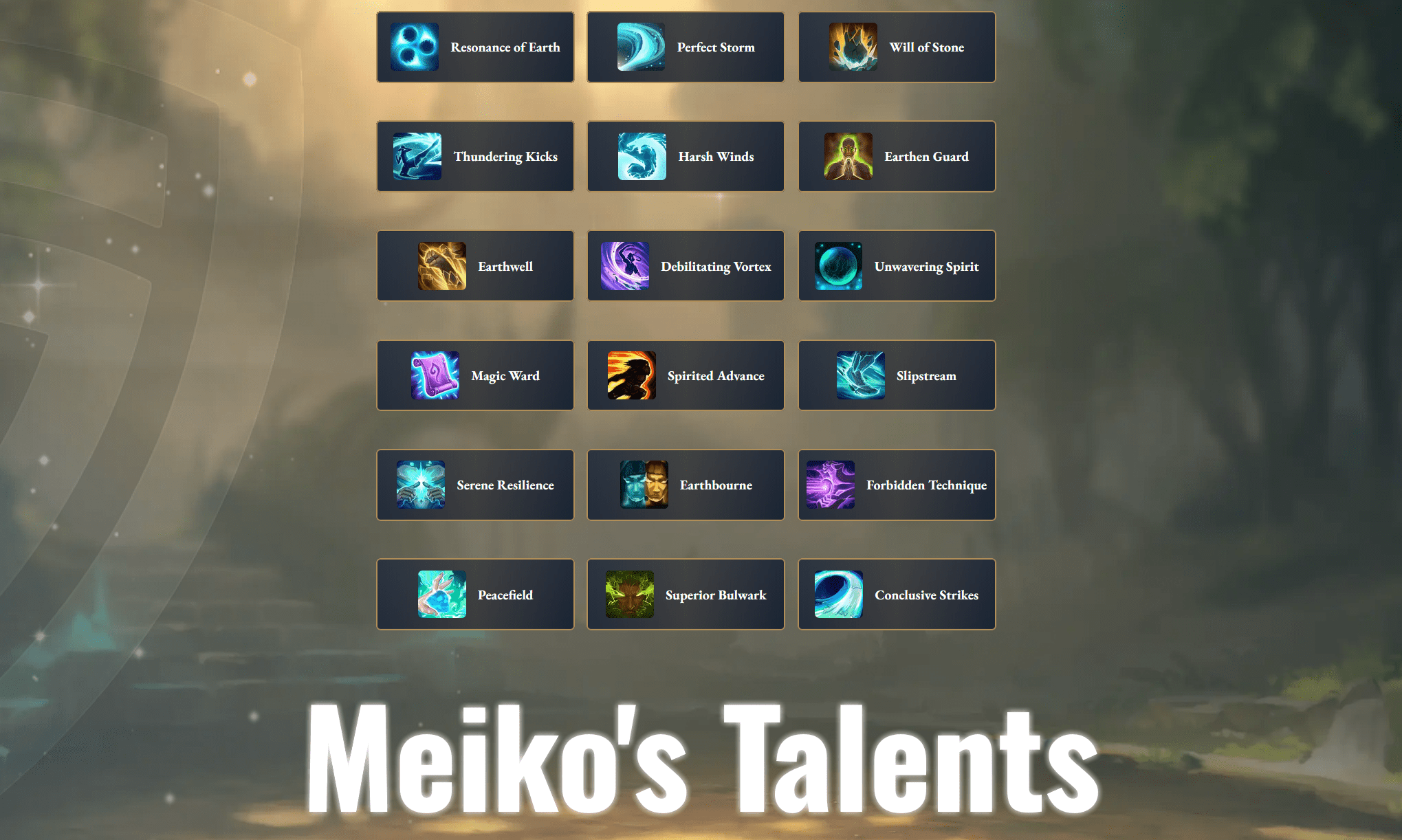 - Earthern Guard (2C) – Boosts Earth Fist damage and finishers.