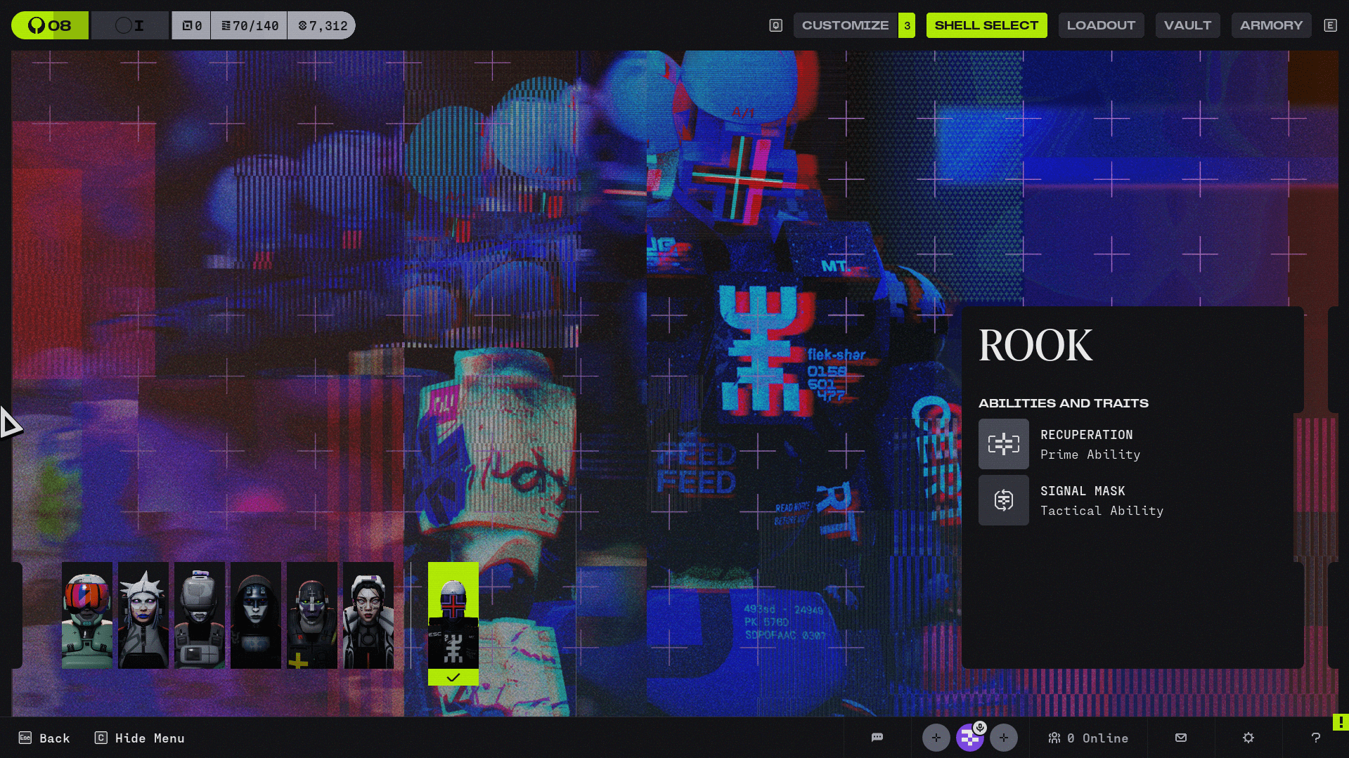 Its kit is all about survival and economy rather than direct team utility. Recuperation gives Rook built-in healing, while Signal Mask helps avoid PvE attention for a while, which makes looting and repositioning much safer. The shell also comes with heavy restrictions: Rook is tied to solo queue, cannot bring normal vault gear, and works more like a self-contained scavenger option than a classic support or entry shell.