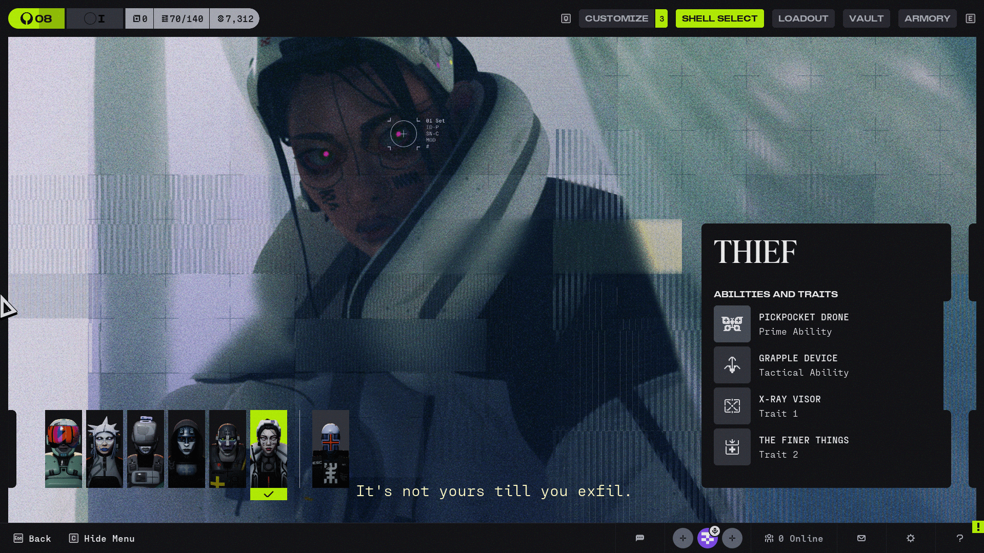 Thief’s kit is based on looting and movement. Pickpocket Drone can be used to take valuable items from the enemy’s backpacks. The Grapple Device is great for movement and can be used as an escape route. The X-Ray Visor can be used to see loot through walls and enemies, making it a great scouting tool for Thief during the run. The Finer Things also boosts the handling and recharge rate of the Grapple Device as the backpack is being filled out.
