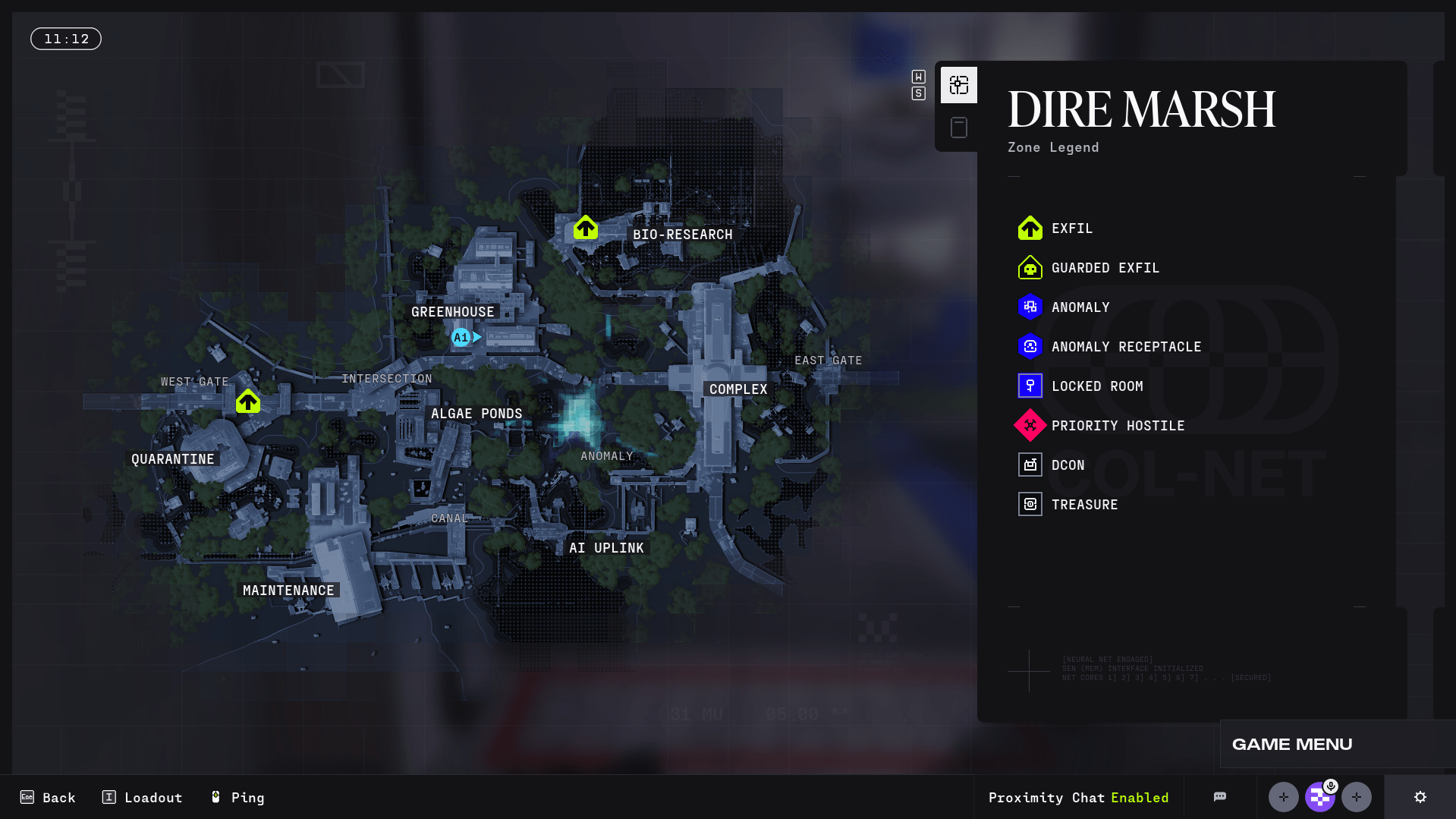 The areas on the zone list give players an idea of the type of map Dire Marsh is. For example, areas like Algae Ponds, Greenhouse, and Bio-Research are related to the research and farming aspects of the colony. Then, areas like Complex, Maintenance, and AI Uplink are related to industrial areas, combat, and mission areas.