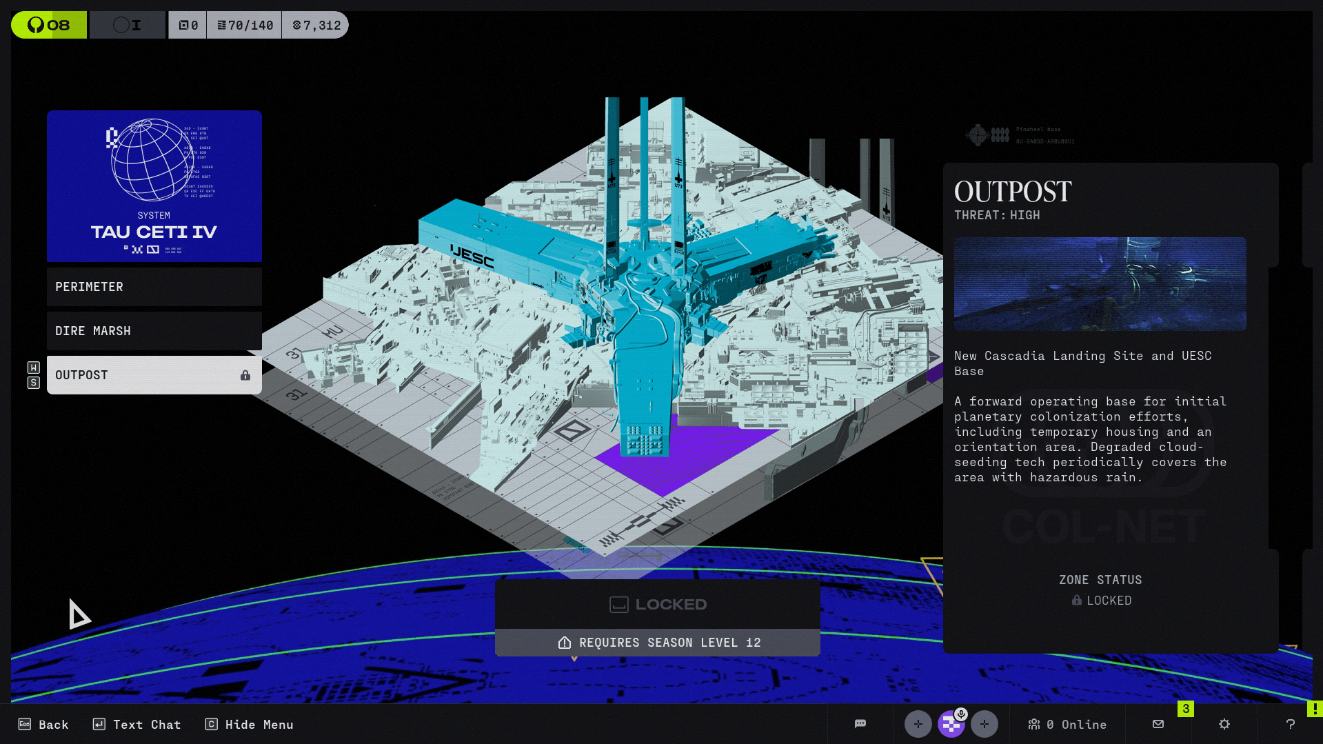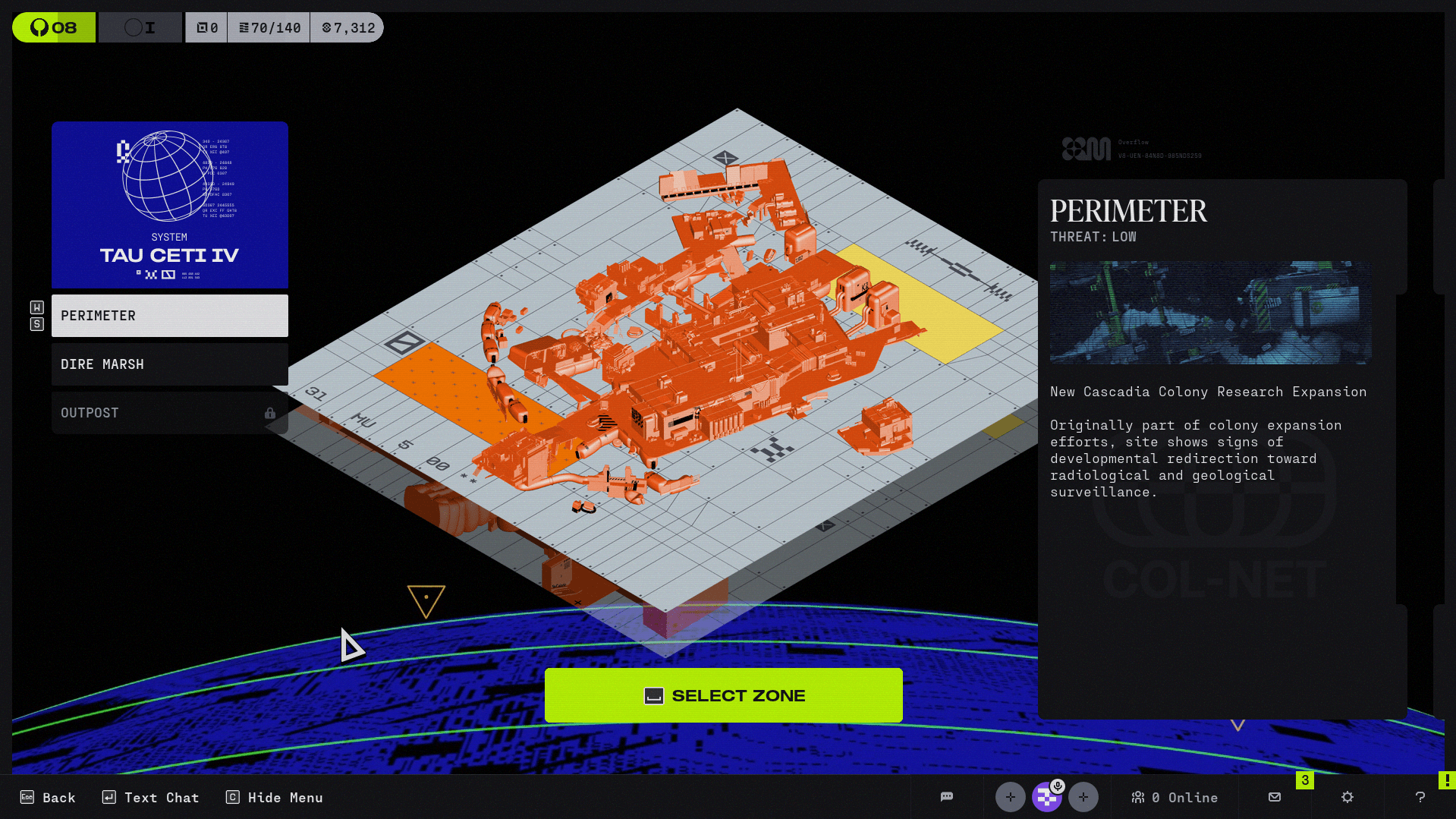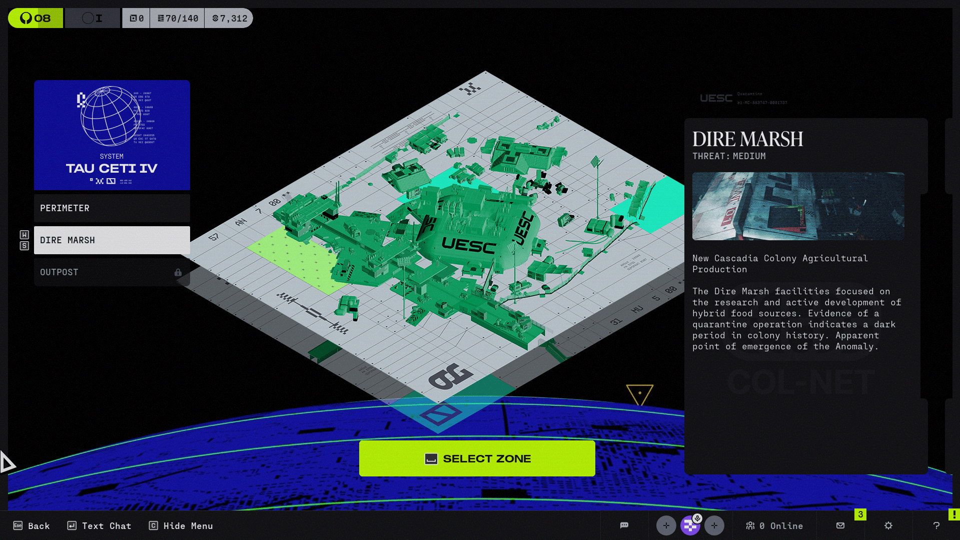 Marathon currently has four main maps. There are surface zones on Tau Ceti IV: Perimeter, Dire Marsh, and Outpost. The fourth map is Cryo Archive, which is the first endgame zone aboard the UESC Marathon.