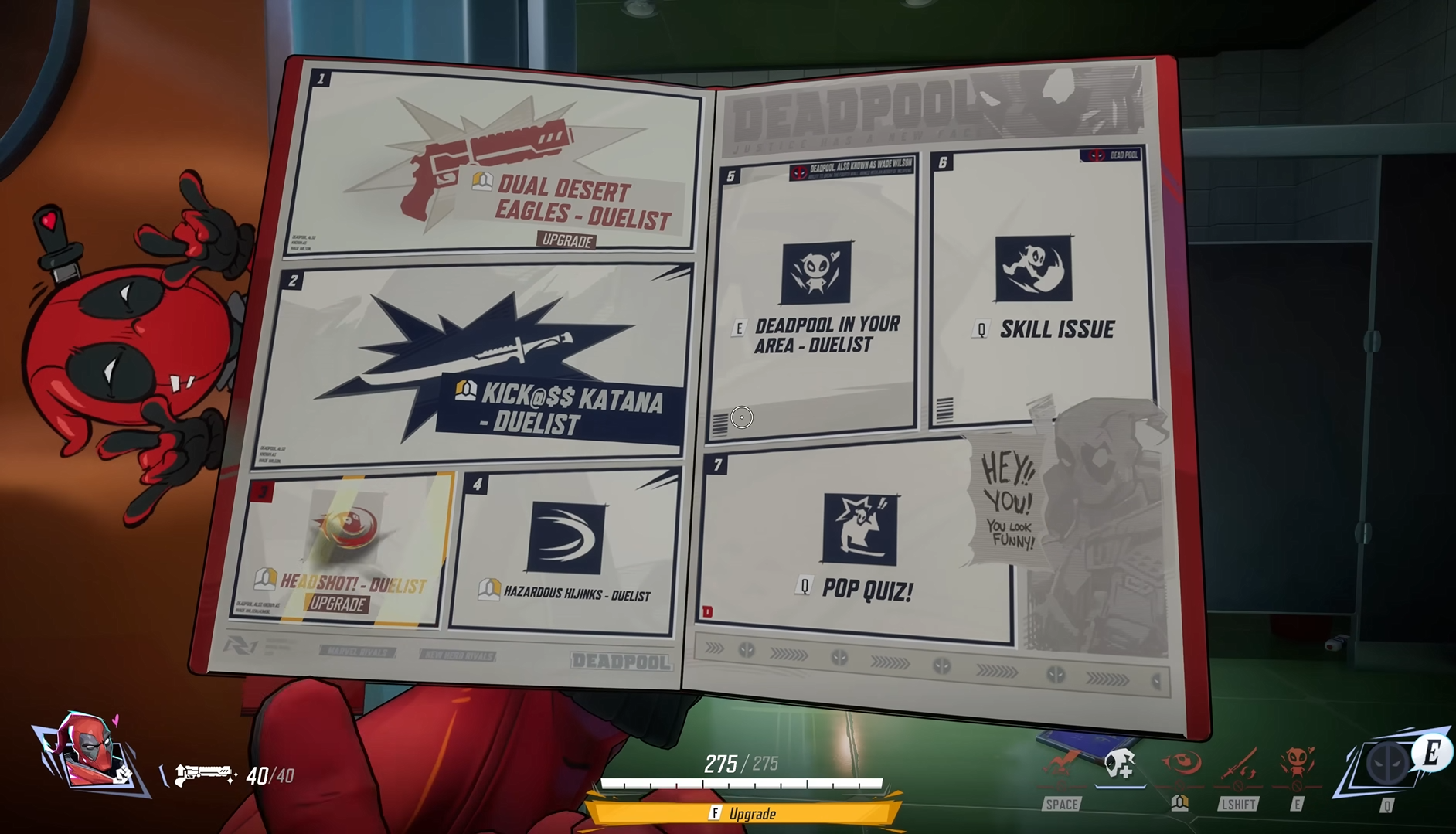 | Progression Book (All Roles) | F | Opens the progression system to upgrade Deadpool’s skills during the match. |