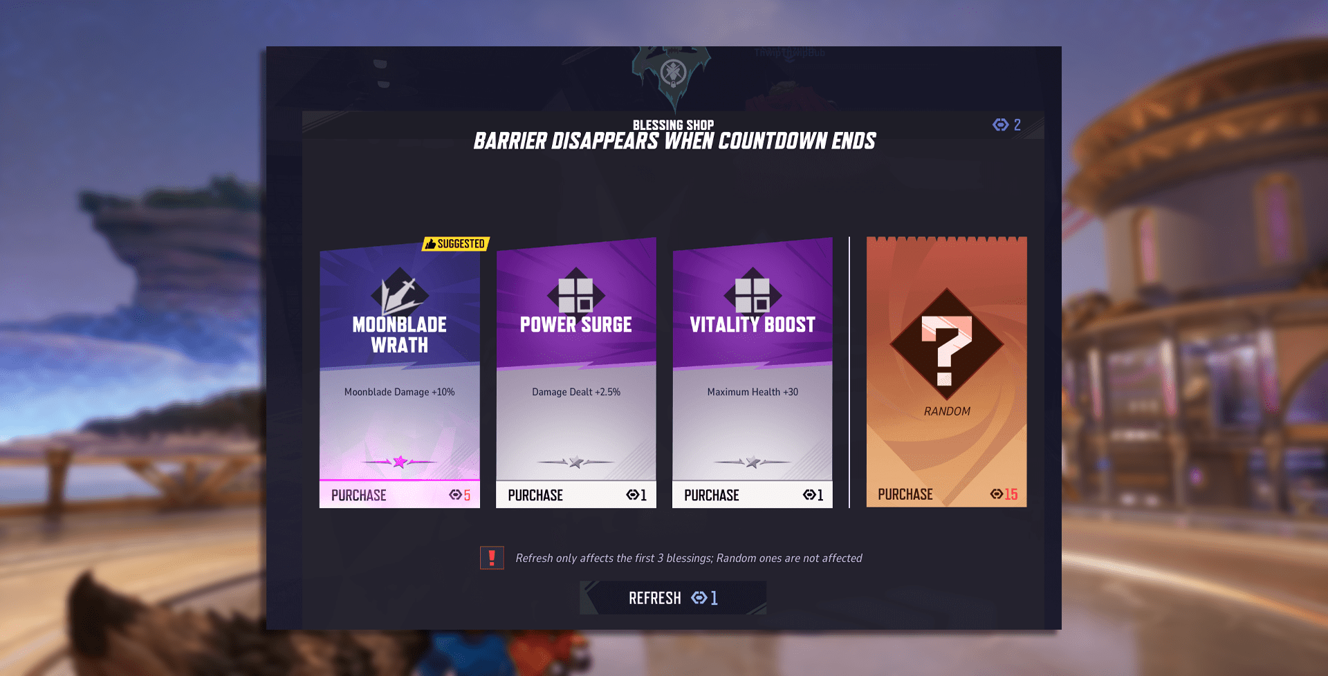 Between every wave, you’ll see a glowing circle — that’s your upgrade zone. You’ve got less than a minute, so don’t waste time. You should spend all your Moon Power, as saving it rarely pays off. If the Blessings don’t fit your build, it’s always worth hitting Refresh to reroll.