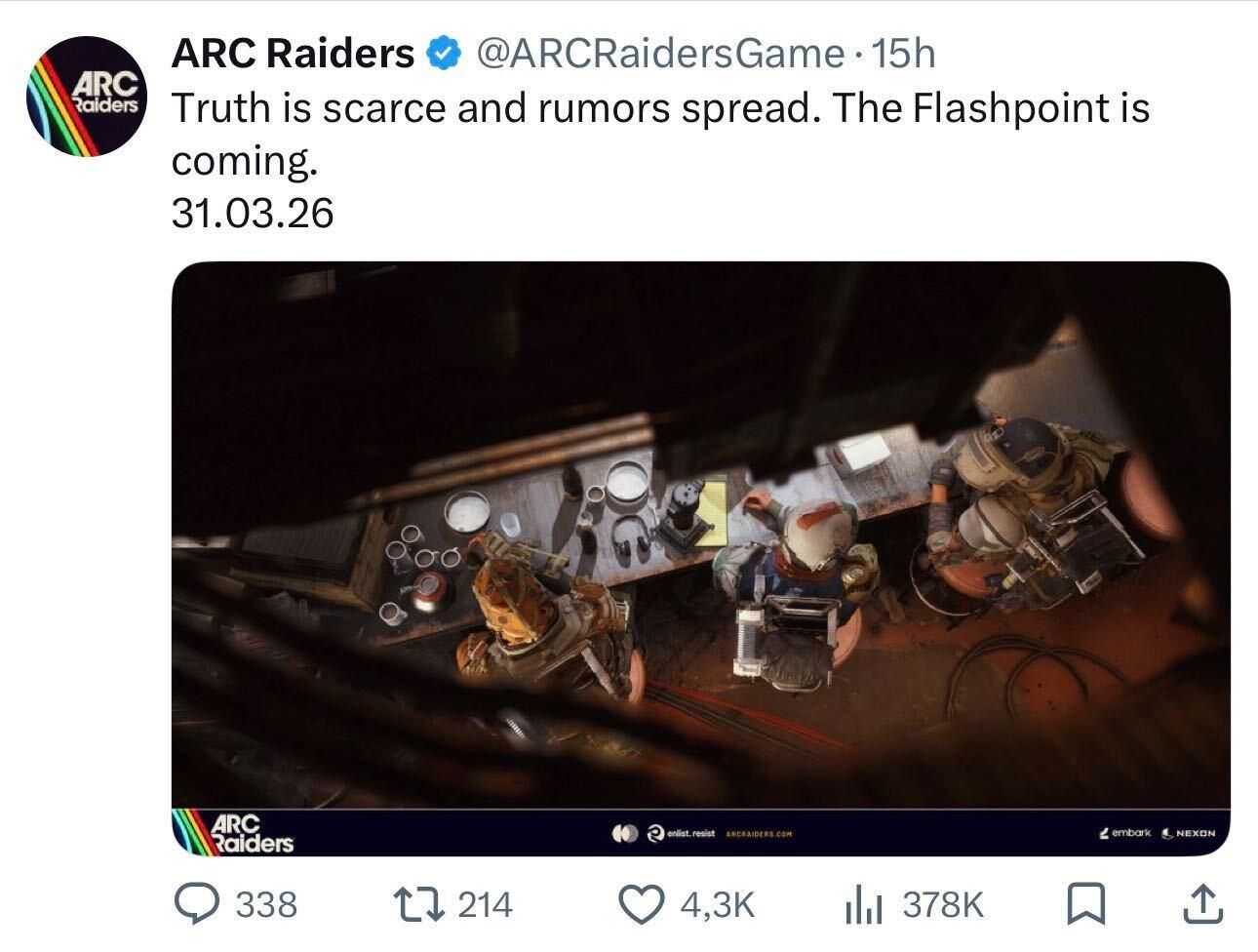 Embark Studios has locked in the release date for the next major ARC Raiders update. The ARC Raiders Flashpoint update will launch on March 31, 2026, and will be available on PC, PlayStation 5, and Xbox Series X|S. The studio confirmed the date in a new official post, using the line: Truth is scarce, and rumors spread. The Flashpoint is coming.