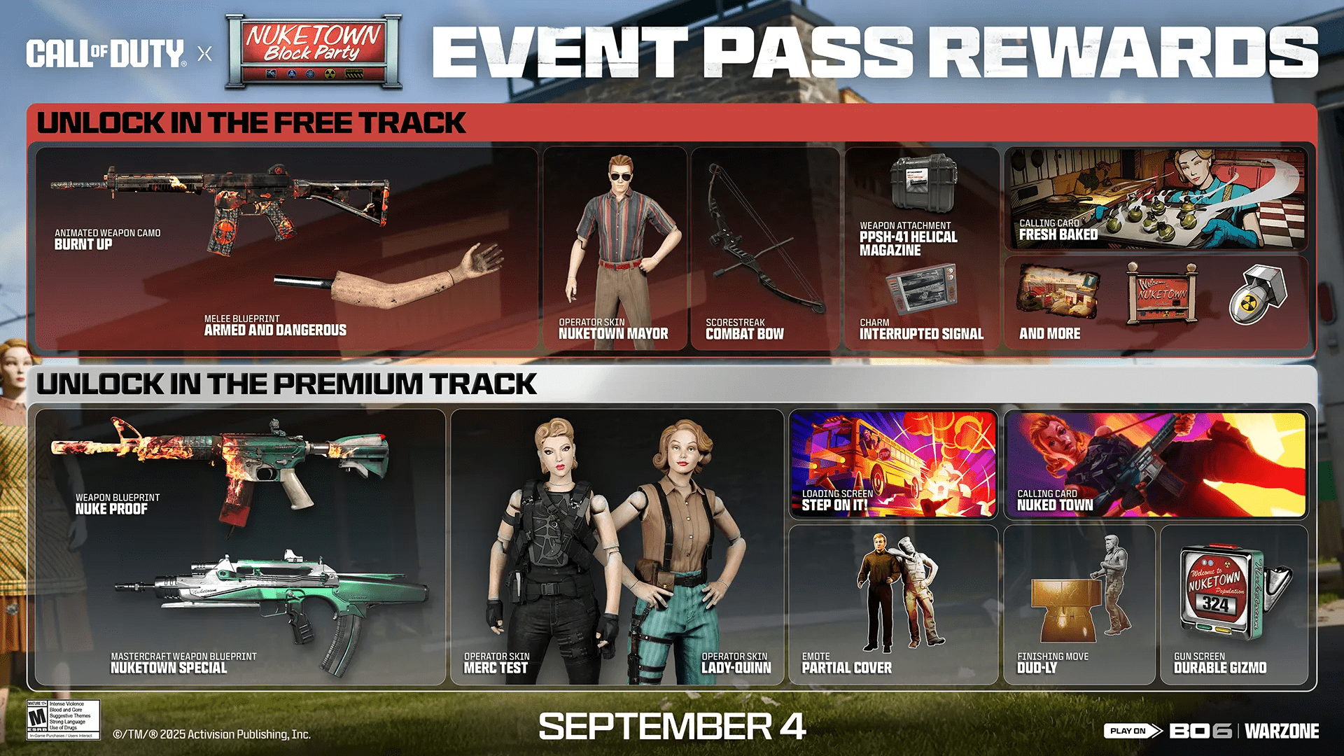 | Free | Burnt Up (Weapon Blueprint) Armed and Dangerous (Weapon Blueprint) Nuketown Mayor (Operator Skin) Combat Bow (Scorestreak) PPSh-41 Helical Magazine (Attachment) Interrupted Signal (Charm) Fresh Baked (Calling Card) 3 unnamed rewards (likely Loading Screens, Emblems, or Stickers) |