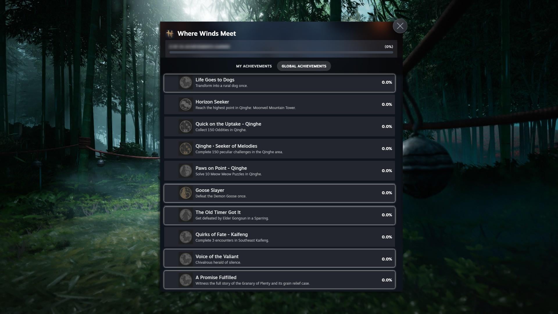 Aside from basic trophies, there are Where Winds Meet hidden achievements, including Goose Slayer, A Promise Fulfilled, Life Goes to Dogs, The Old Timer Got It, and Voice of the Valiant. These achievements are marked as hidden because they are unlocked through non-standard actions: unusual transformations, rare story scenes, secret duels, etc.