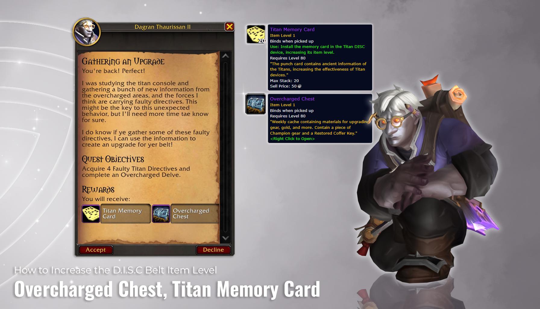 To increase the D.I.S.C. belt item level in WoW Patch 11.1.7, pick up and complete a weekly quest Gathering an Upgrade from Dagran Thaurissan II (the same questgiver as for the initial task):