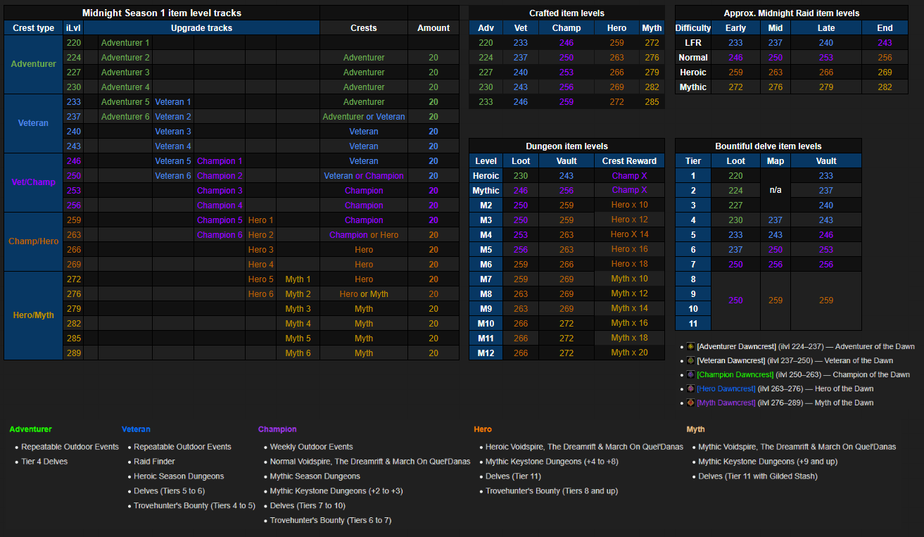 In summary, upgrading gear in Midnight became easier, but now you need to plan your upgrades. Also, remember to upgrade the best slots starting from the Hero track to optimize Crest costs, and complete weekly activities to ensure reaching the weekly Crest cap.