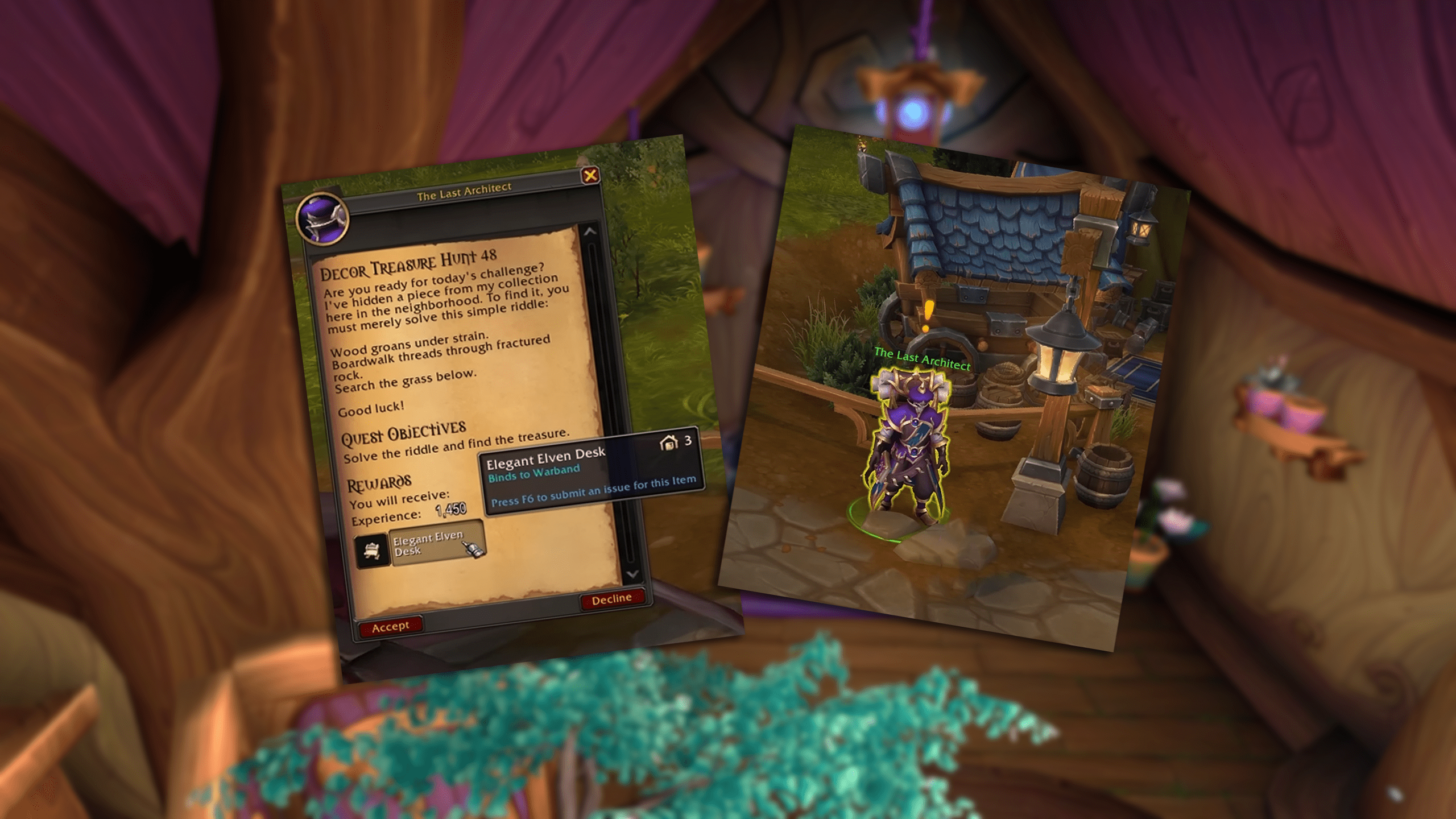 In WoW Midnight, housing will not only provide you with a home, but also with various quests. You can pick up a quest at the centre of your district from NPCs, e.g., The Lost Architect, Helmi Cooper, and others. Quest rewards include furniture and decoration options, dyes, and more.