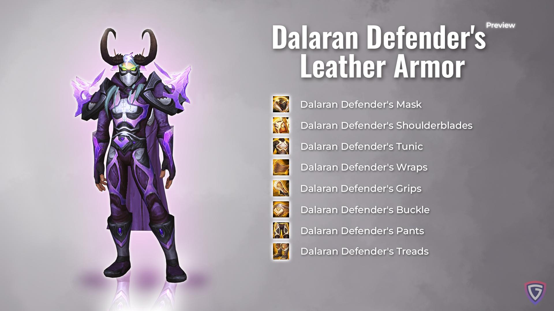 Item Price Slot Type Dalaran Defender’s Shoulderblades 3500 Residual Memories Shoulder Leather Armor Dalaran Defender’s Tunic 5000 Residual Memories Chest Leather Armor Dalaran Defender’s Mask 5000 Residual Memories Head Leather Armor Dalaran Defender’s Buckle 3500 Residual Memories Waist Leather Armor Dalaran Defender’s Treads 3500 Residual Memories Feet Leather Armor Dalaran Defender’s Pants 5000 Residual Memories Legs Leather Armor Dalaran Defender’s Grips 3500 Residual Memories Hands Leather Armor Dalaran Defender’s Wraps 2000 Residual Memories Wrist Leather Armor Dalaran Defender Mail Armor