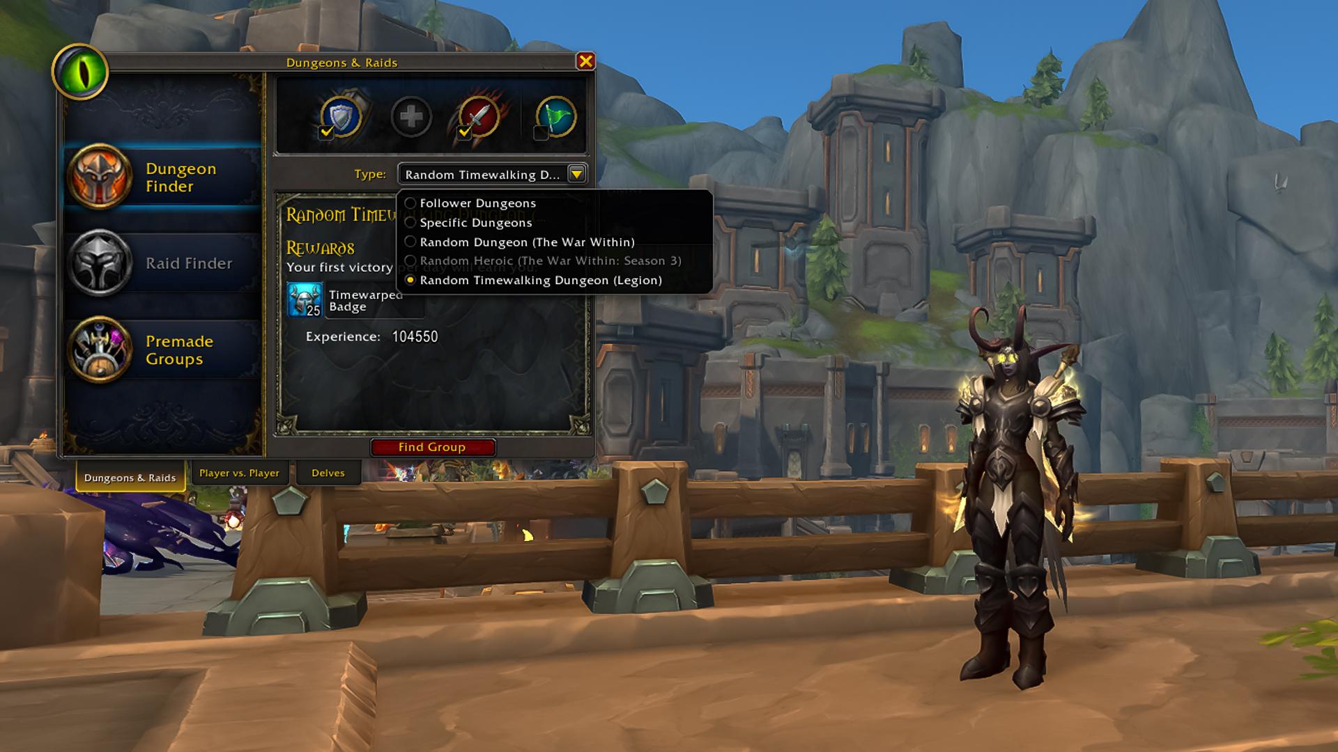 - When the Timewalking Week is active, you can queue in Dungeon Finder and complete themed dungeons from previous expansions.